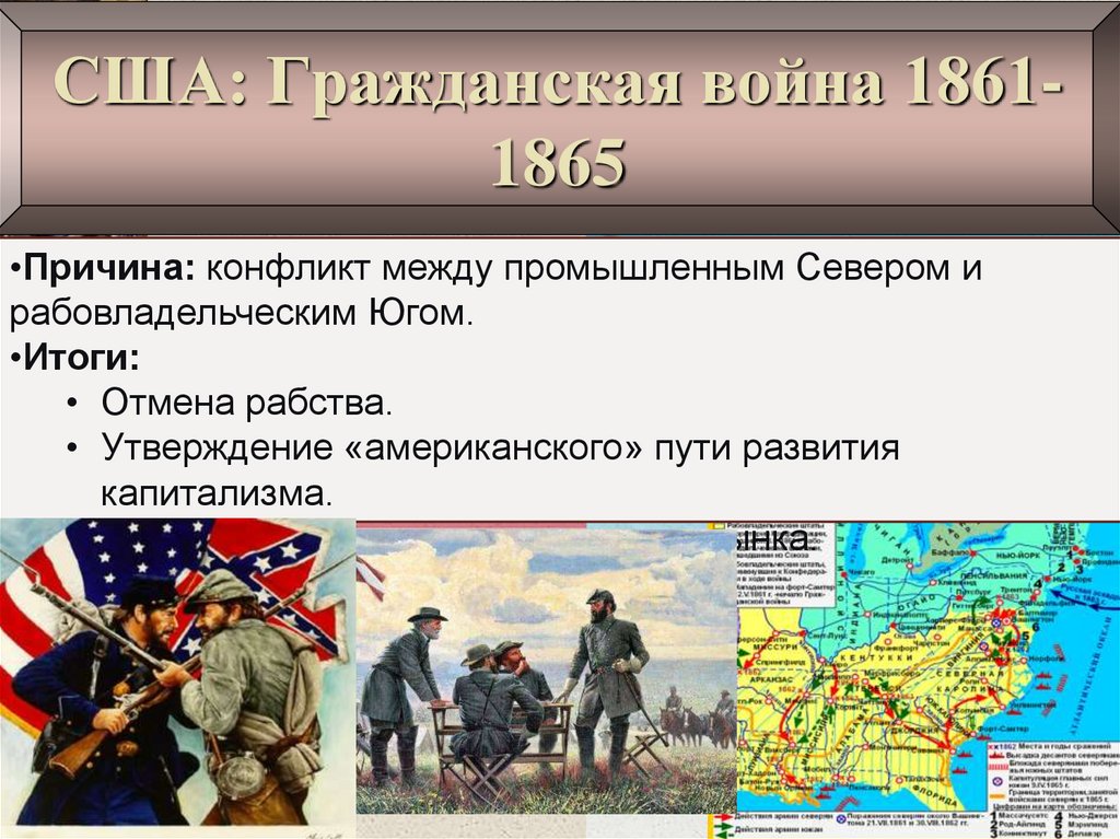 США: Гражданская война 18611865•Причина: конфликт между промышленным Севером и