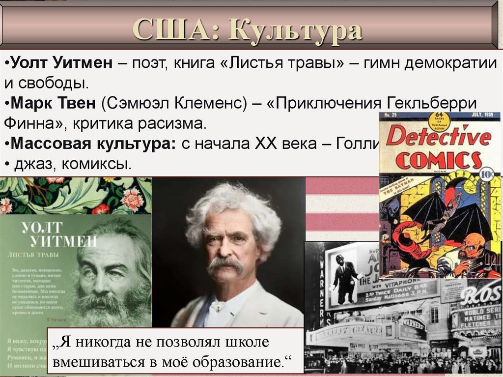 США: Культура•Уолт Уитмен – поэт, книга «Листья травы» – гимн демократии