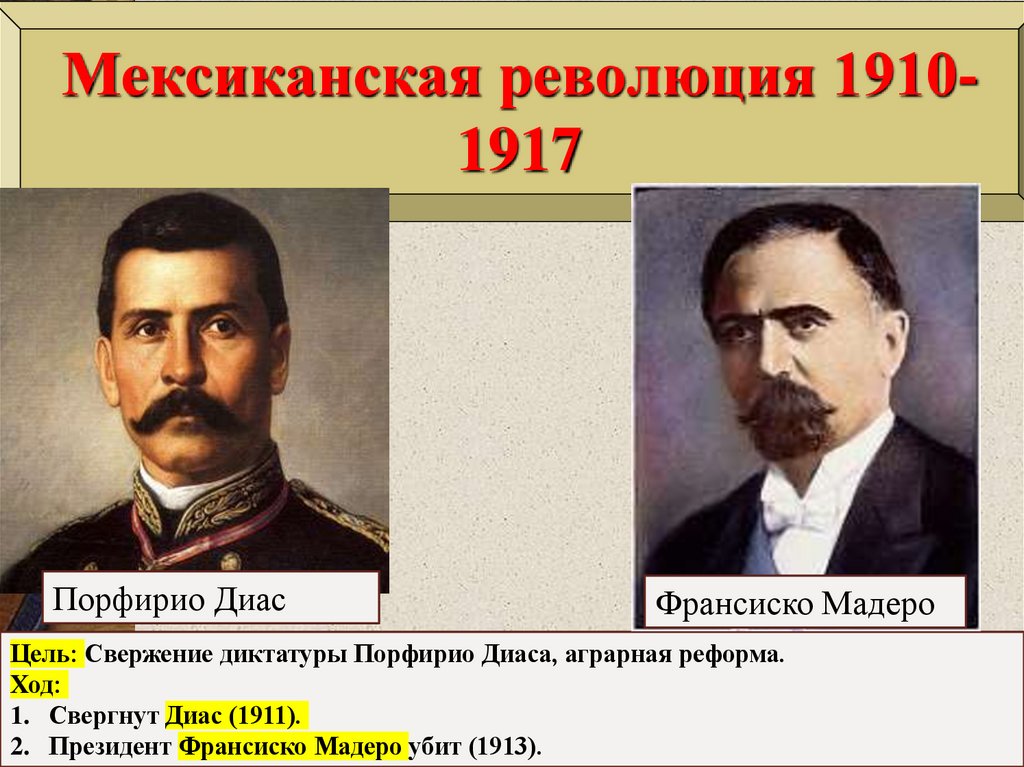 Цель: Свержение диктатуры Порфирио Диаса, аграрная реформа.