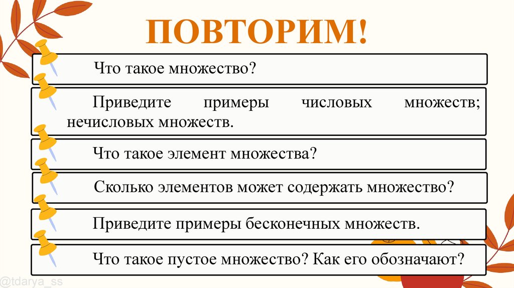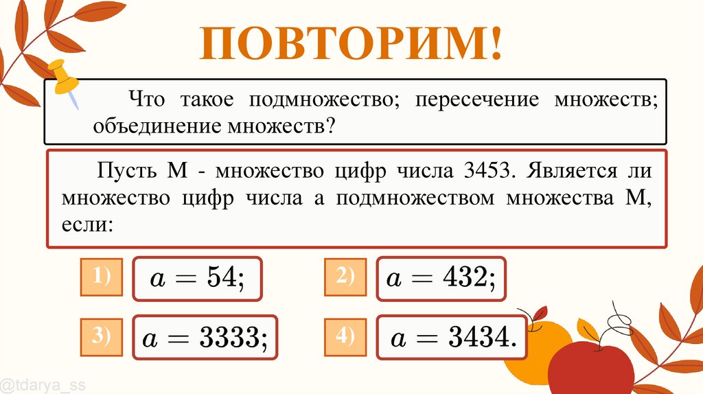 ПОВТОРИМ!Что такое подмножество; пересечение множеств;