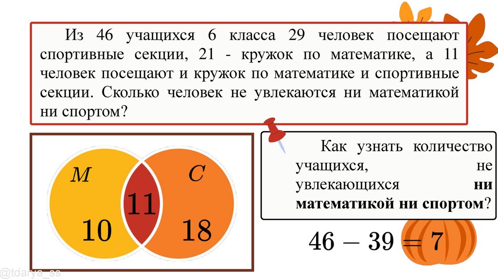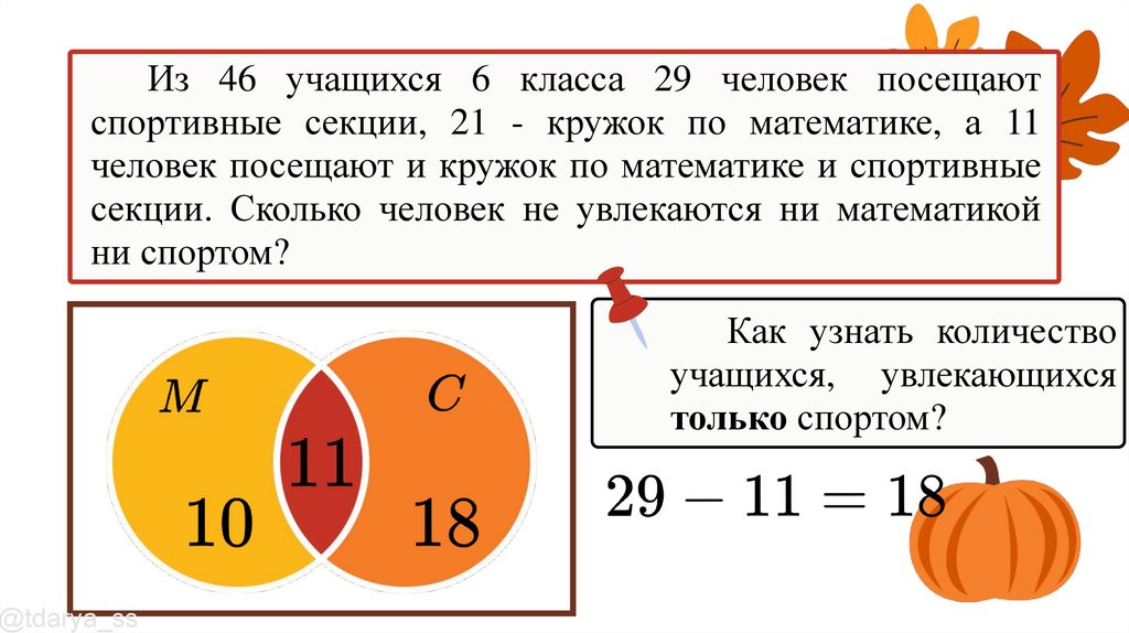 Из 46 учащихся 6 класса 29 человек посещаютспортивные секции, 21 - кружок по математике, а 11