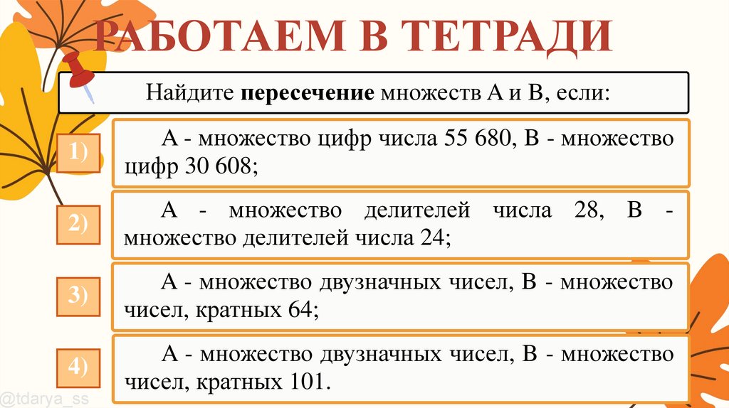 РАБОТАЕМ В ТЕТРАДИНайдите пересечение множеств A и B, если: