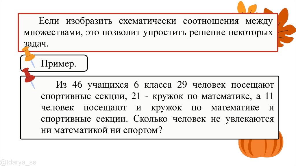 Если изобразить схематически соотношения междумножествами, это позволит упростить решение некоторых