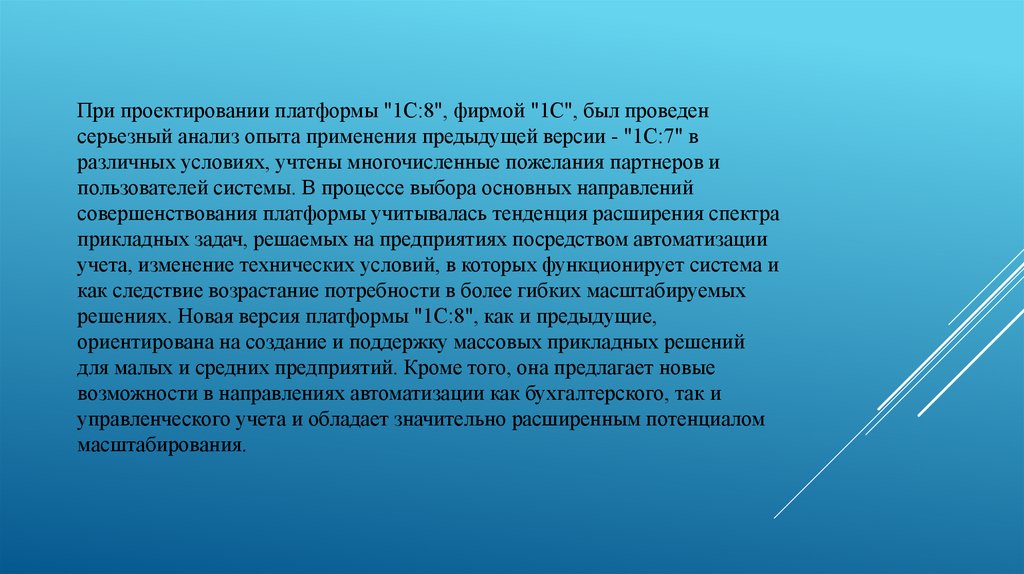 При проектировании платформы "1С:8", фирмой "1С", был проведенсерьезный анализ опыта применения предыдущей версии - "1С:7" в