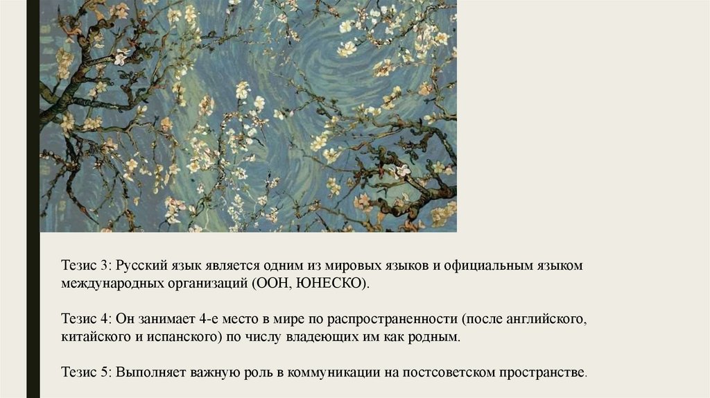 Тезис 3: Русский язык является одним из мировых языков и официальным языкоммеждународных организаций (ООН, ЮНЕСКО).