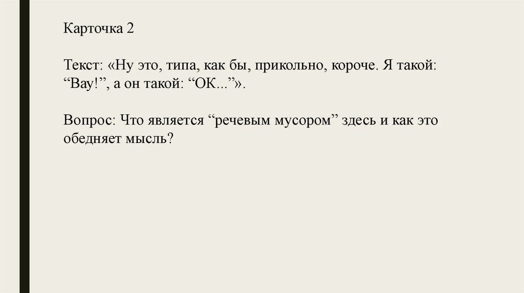 Карточка 2Текст: «Ну это, типа, как бы, прикольно, короче. Я такой: