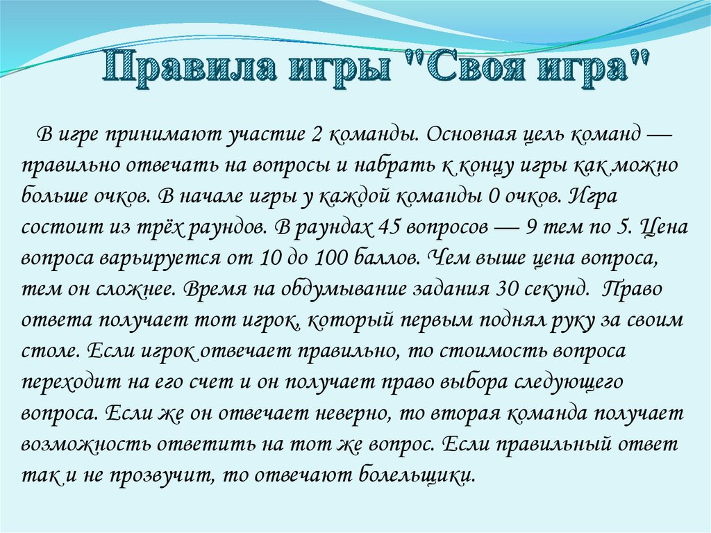 В игре принимают участие 2 команды. Основная цель команд —правильно отвечать на вопросы и набрать к концу игры как можно