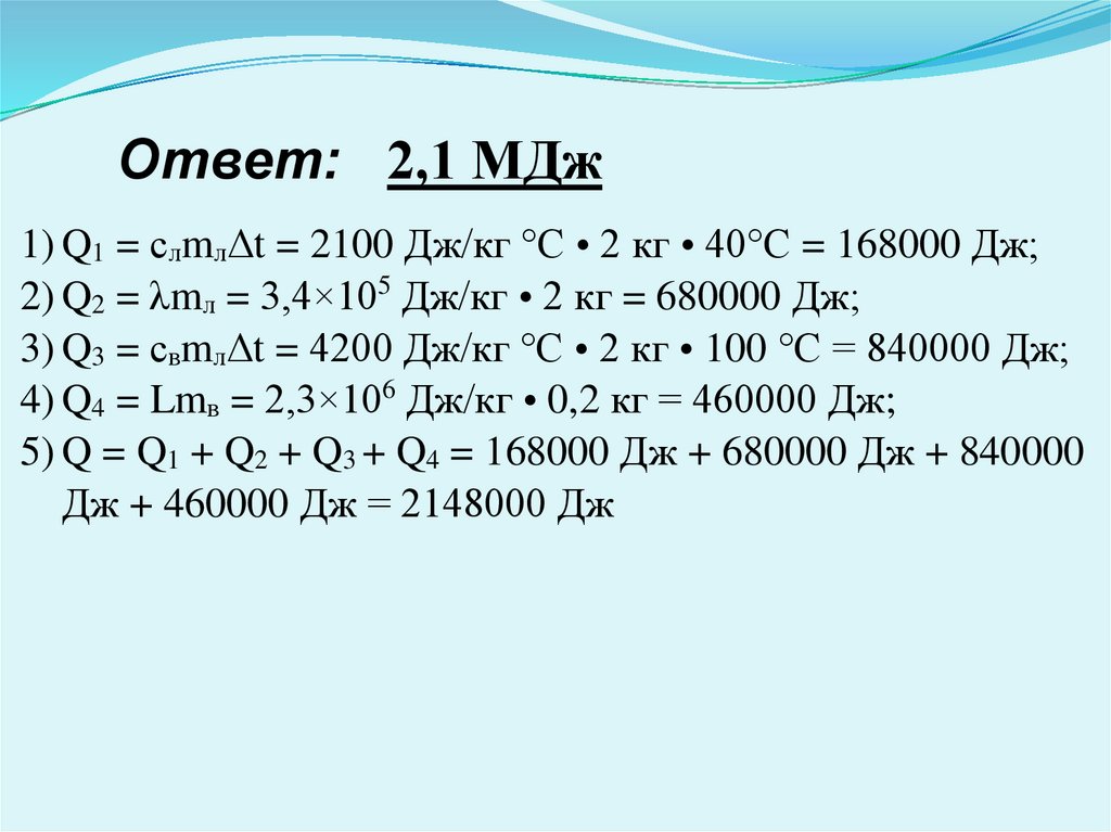 Ответ: 2,1 МДж1) Q1 = слmлΔt = 2100 Дж/кг °С • 2 кг • 40°С = 168000 Дж;