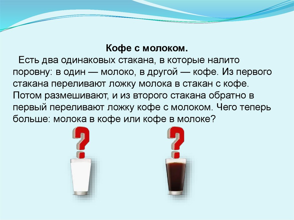 Кофе с молоком.Есть два одинаковых стакана, в которые налито