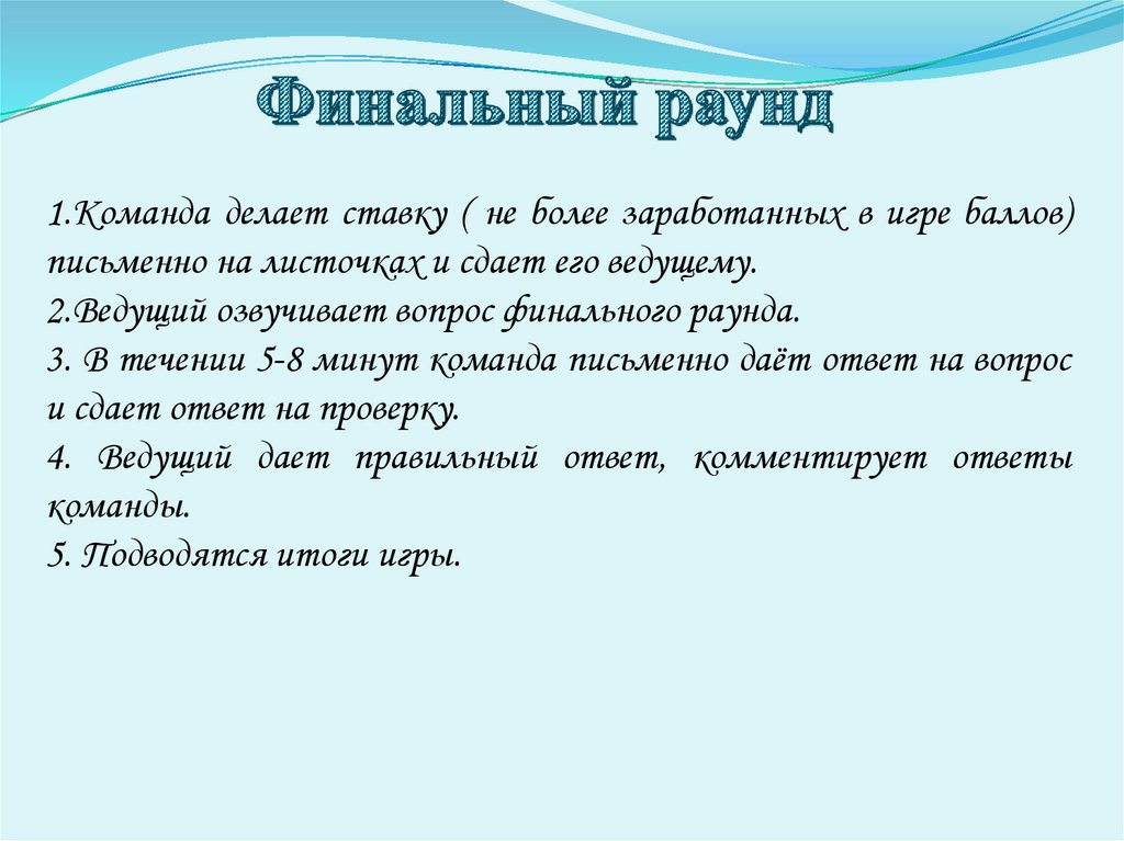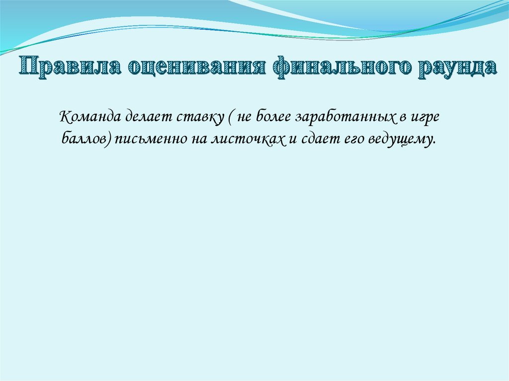 1.Команда делает ставку ( не более заработанных в игре баллов)письменно на листочках и сдает его ведущему.