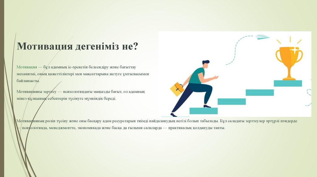 Мотивация дегеніміз не?Мотивация — бұл адамның іс-әрекетін белсендіру және бағыттау