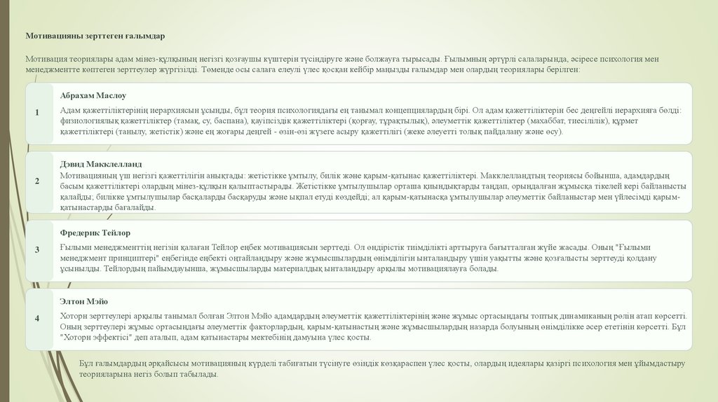 Мотивацияны зерттеген ғалымдарМотивация теориялары адам мінез-құлқының негізгі қозғаушы күштерін түсіндіруге және болжауға тырысады. Ғылымның әртүрлі салаларында, әсіресе психология мен