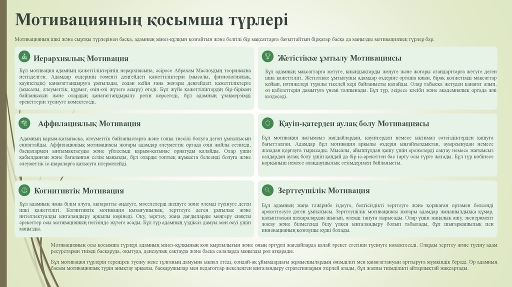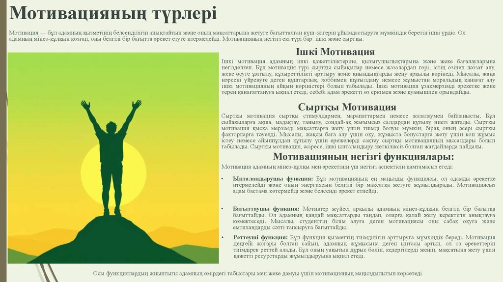 Мотивацияның түрлеріМотивация — бұл адамның қызметінің белсенділігін анықтайтын және оның мақсаттарына жетуге бағытталған күш-жігерін ұйымдастыруға мүмкіндік беретін ішкі үрдіс. Ол