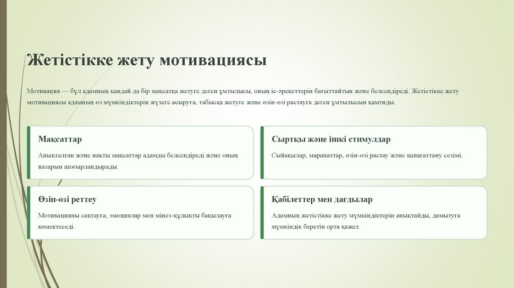 Жетістікке жету мотивациясыМотивация — бұл адамның қандай да бір мақсатқа жетуге деген ұмтылысы, оның іс-әрекеттерін бағыттайтын және белсендіреді. Жетістікке жету