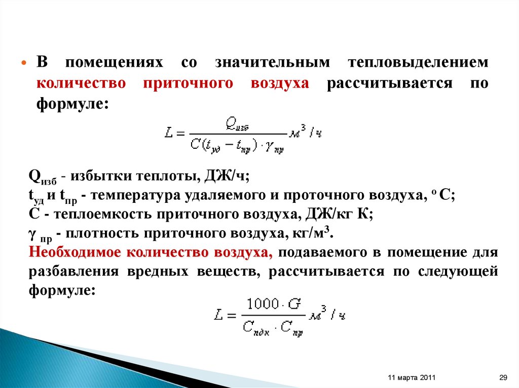 В помещениях со значительным тепловыделениемколичество приточного воздуха рассчитывается по
