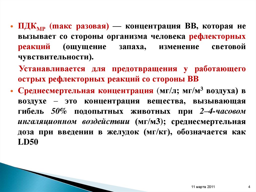 ПДКМР (maкс разовая) — концентрация ВВ, которая невызывает со стороны организма человека рефлекторных