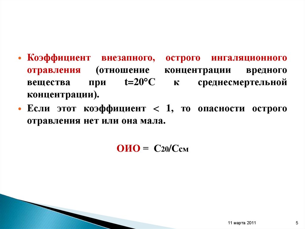 Коэффициент внезапного, острого ингаляционногоотравления (отношение концентрации вредного