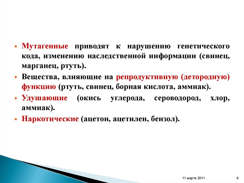 Мутагенные приводят к нарушению генетическогокода, изменению наследственной информации (свинец,