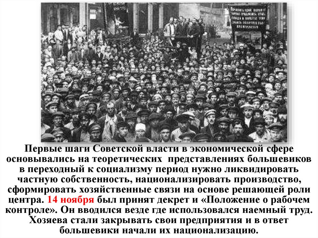 Первые шаги Советской власти в экономической сфереосновывались на теоретических представлениях большевиков