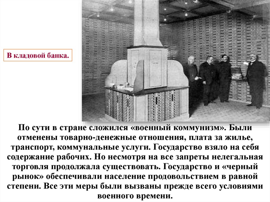 В кладовой банка.По сути в стране сложился «военный коммунизм». Были