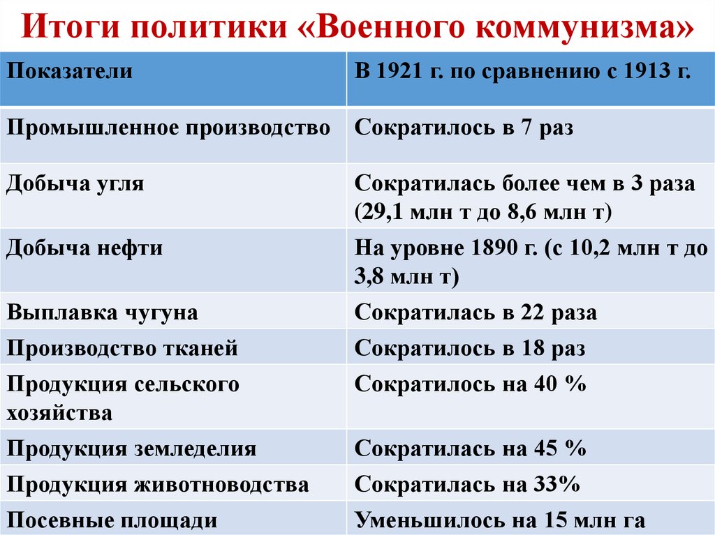 Итоги политики «Военного коммунизма»Показатели