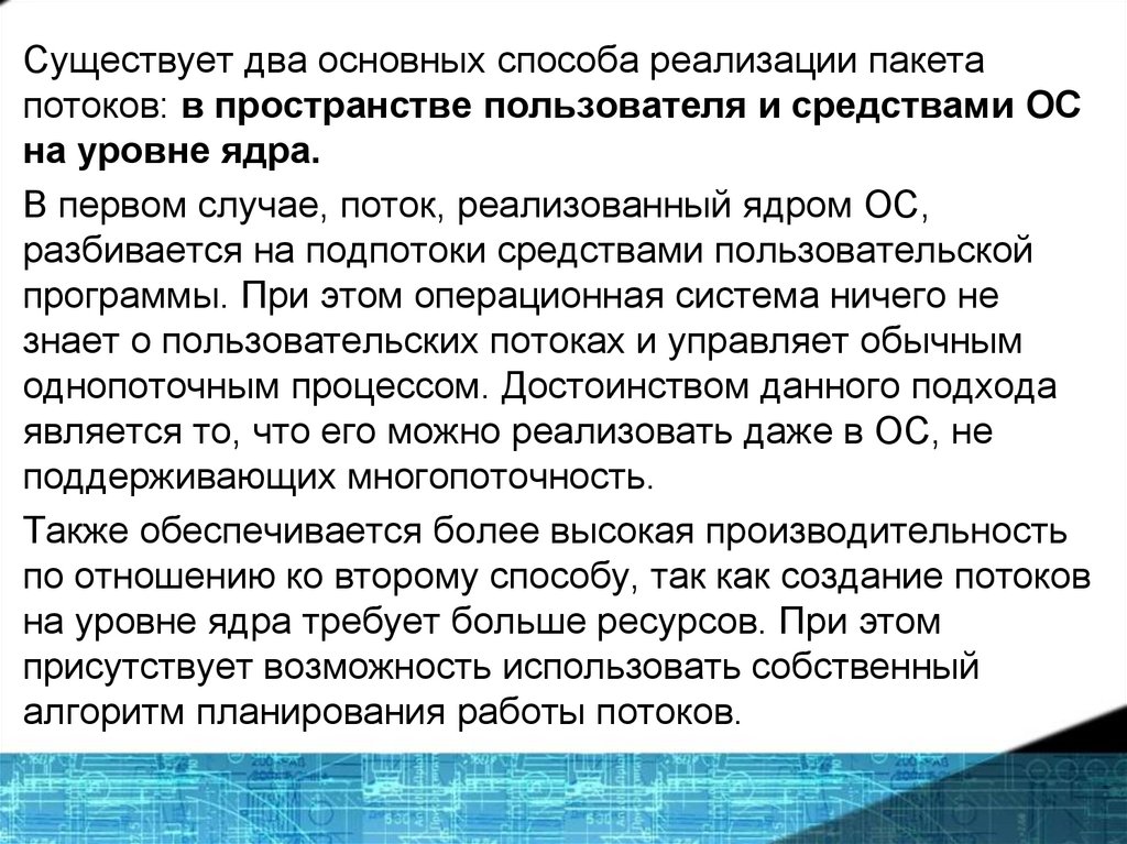 Существует два основных способа реализации пакетапотоков: в пространстве пользователя и средствами ОС
