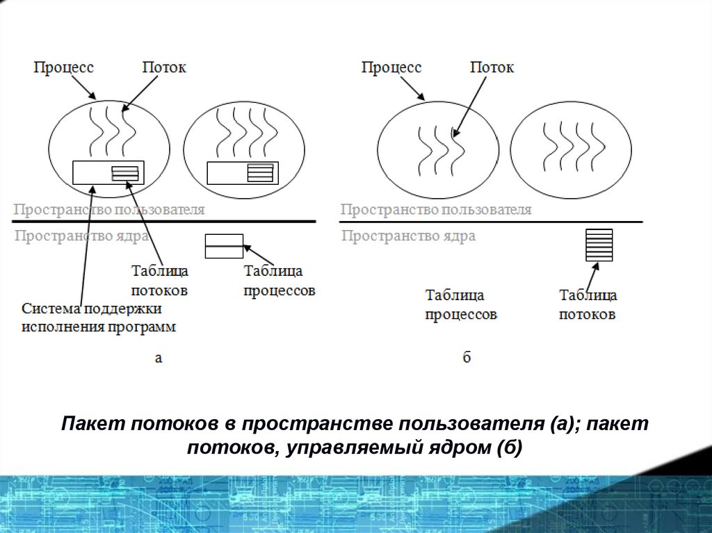 Пакет потоков в пространстве пользователя (а); пакетпотоков, управляемый ядром (б)