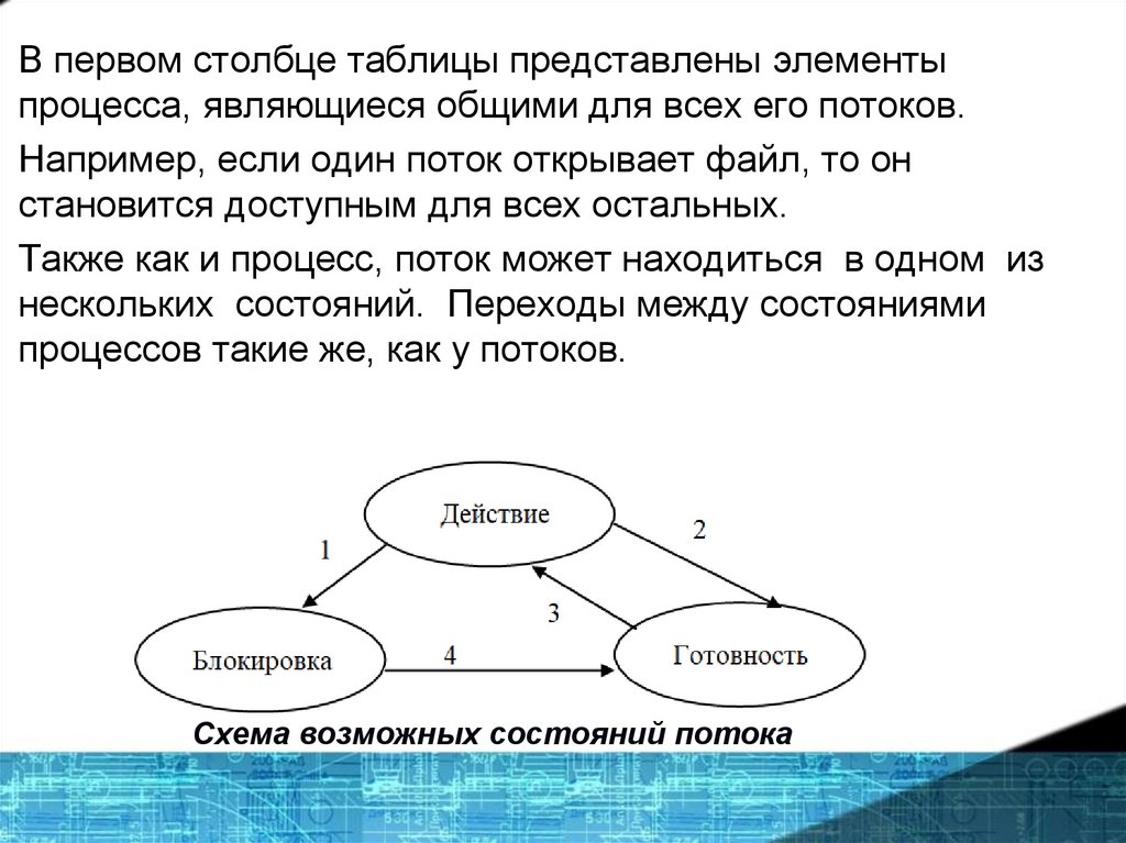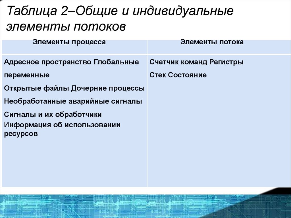 В первом столбце таблицы представлены элементыпроцесса, являющиеся общими для всех его потоков.