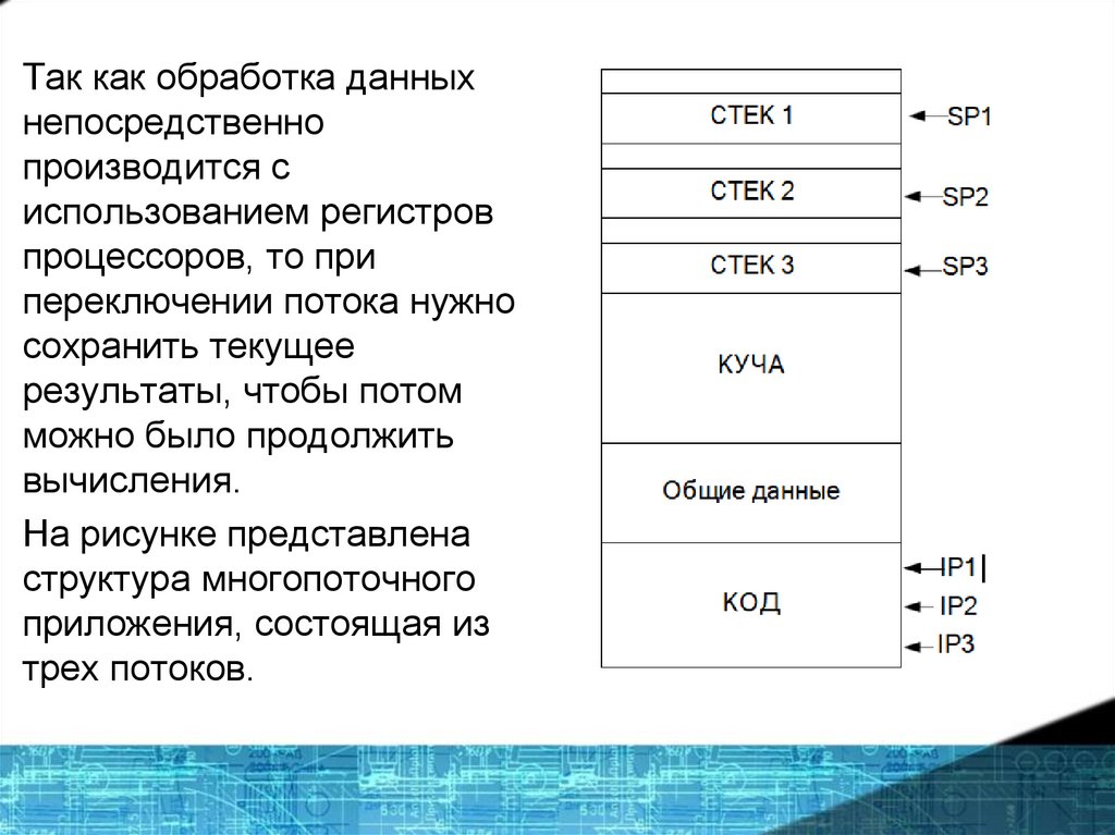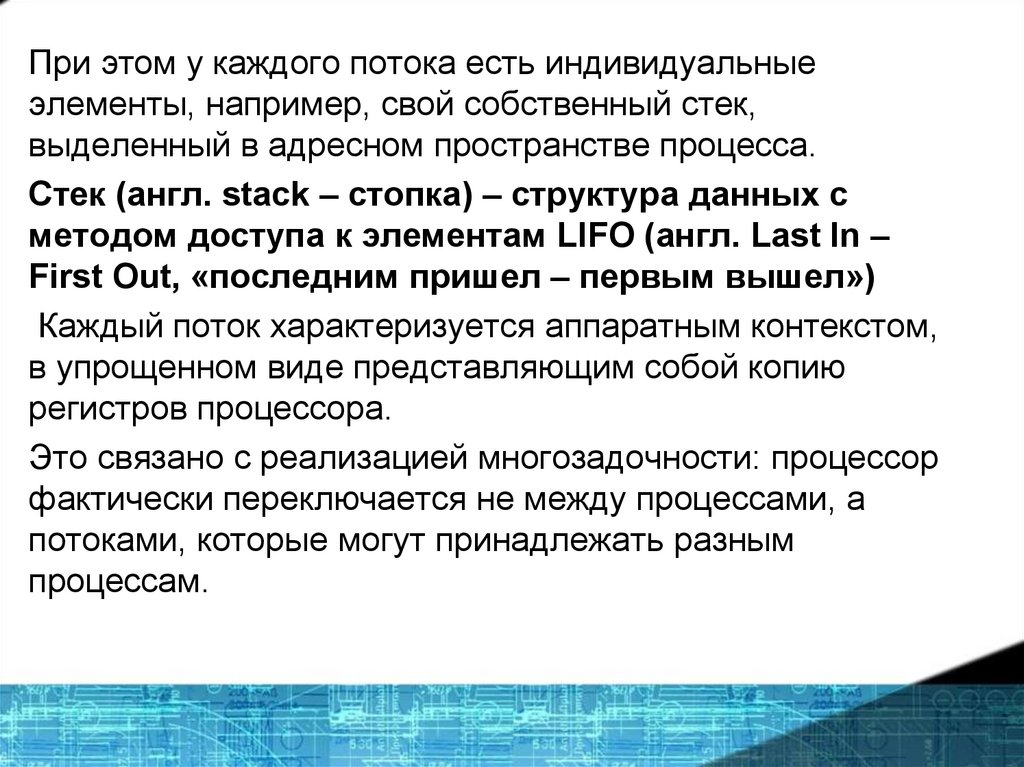 Кроме того, поток содержит собственные регистры, стек и