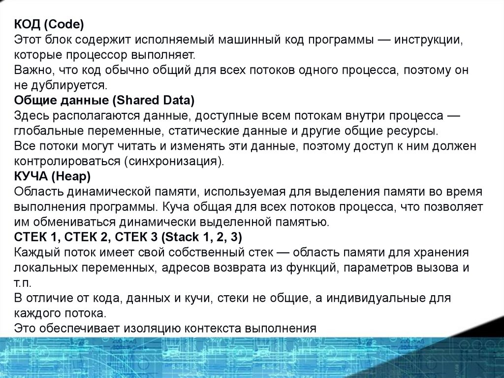 При этом у каждого потока есть индивидуальныеэлементы, например, свой собственный стек,