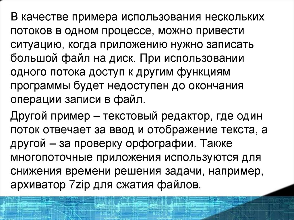 В качестве примера использования несколькихпотоков в одном процессе, можно привести