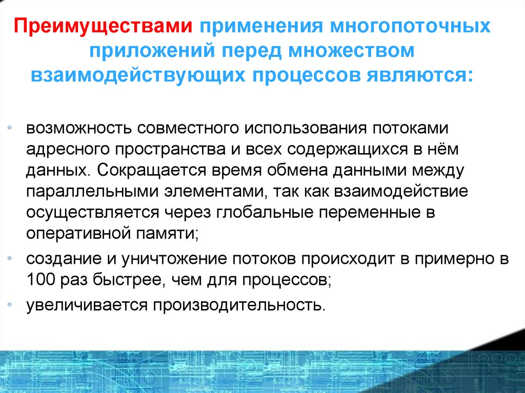 Преимуществами применения многопоточныхприложений перед множеством