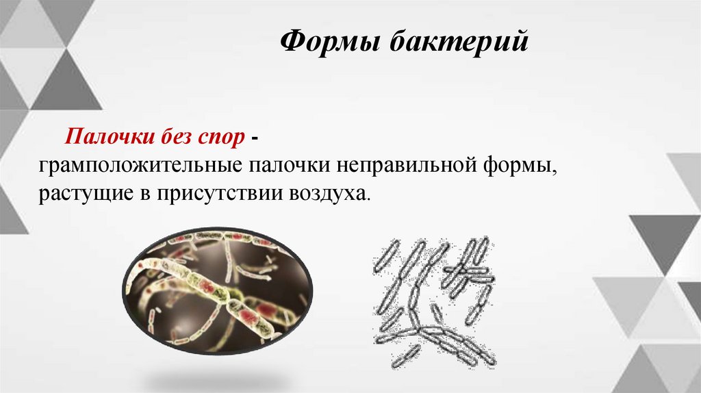Формы бактерийПалочки без спор грамположительные палочки неправильной формы,