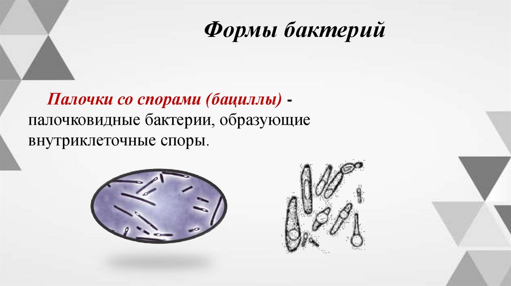 Формы бактерийПалочки со спорами (бациллы) палочковидные бактерии, образующие