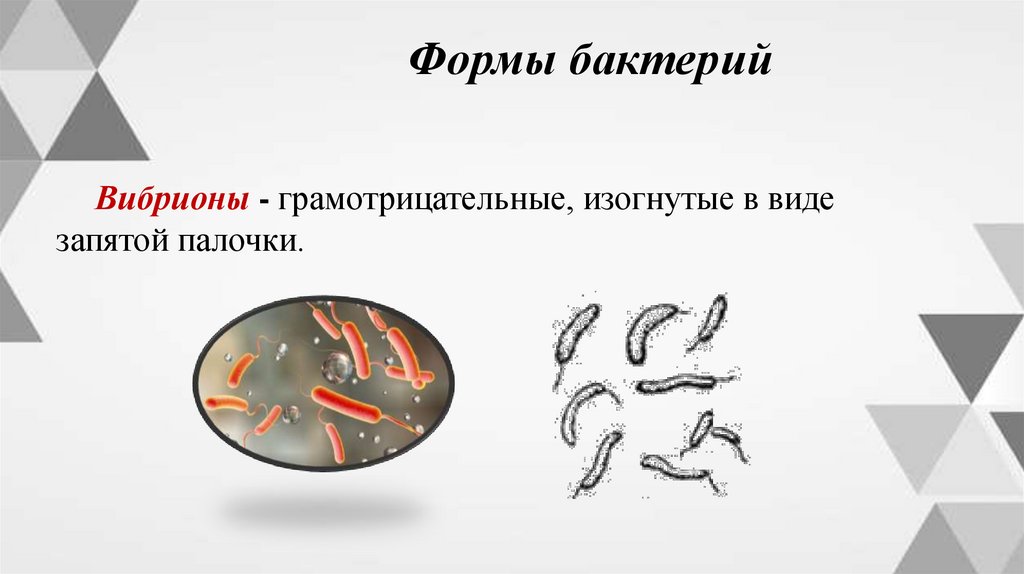 Формы бактерийВибрионы - грамотрицательные, изогнутые в виде