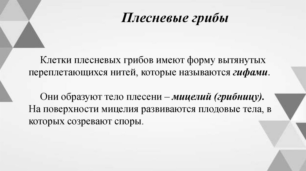 Плесневые грибыКлетки плесневых грибов имеют форму вытянутых