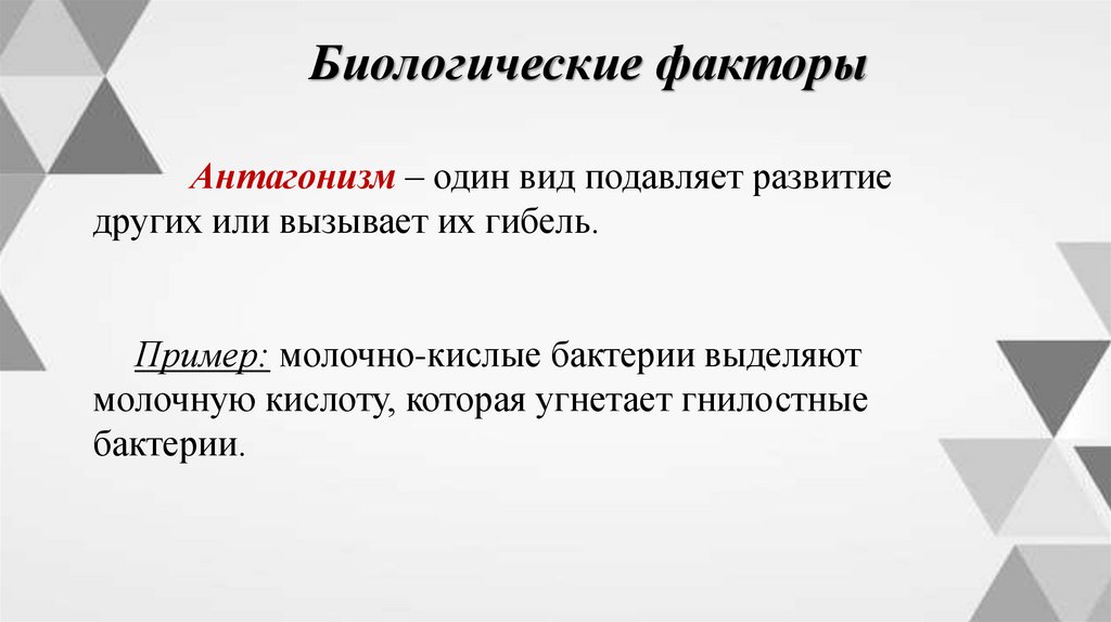 Биологические факторыАнтагонизм – один вид подавляет развитие