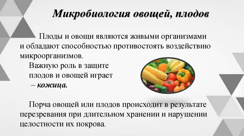 Микробиология овощей, плодовПлоды и овощи являются живыми организмами