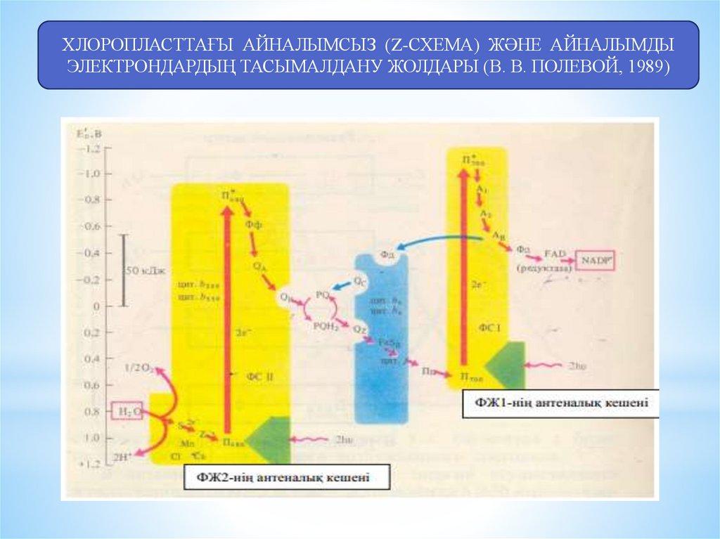 ХЛОРОПЛАСТТАҒЫ АЙНАЛЫМСЫЗ (Z-СХЕМА) ЖӘНЕ АЙНАЛЫМДЫЭЛЕКТРОНДАРДЫҢ ТАСЫМАЛДАНУ ЖОЛДАРЫ (В. В. ПОЛЕВОЙ, 1989)