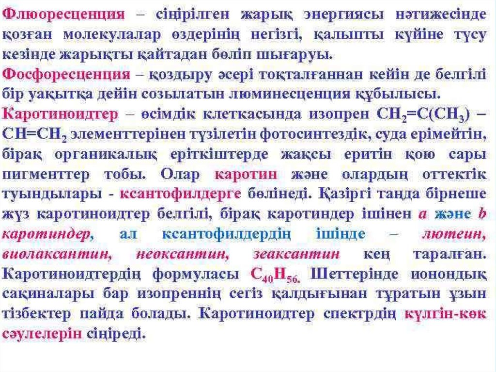 Флуоресценция. Каротиноидтар. Фикобиллиндер.