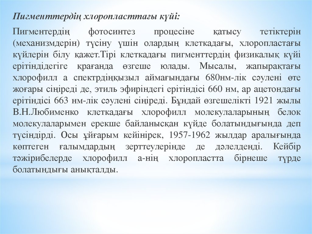 В.Н.Любименко клеткадағы хлорофилл молекулаларының белок