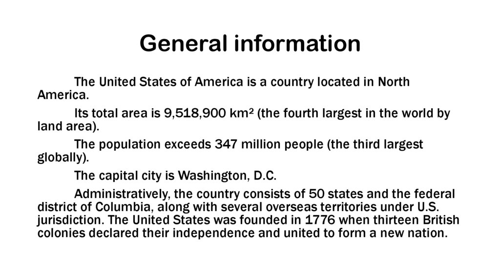 The United States is a federal republic composed of 50 states. In addition, theDistrict of Columbia is a separate federal district that hosts the nation’s capital,