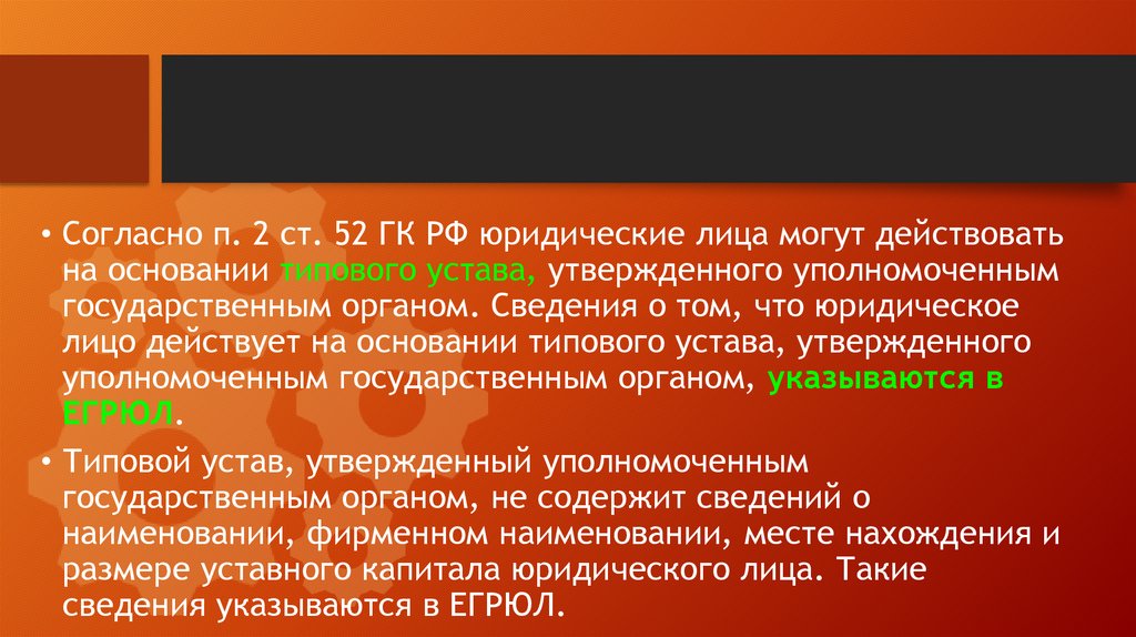 • Согласно п. 2 ст. 52 ГК РФ юридические лица могут действоватьна основании типового устава, утвержденного уполномоченным