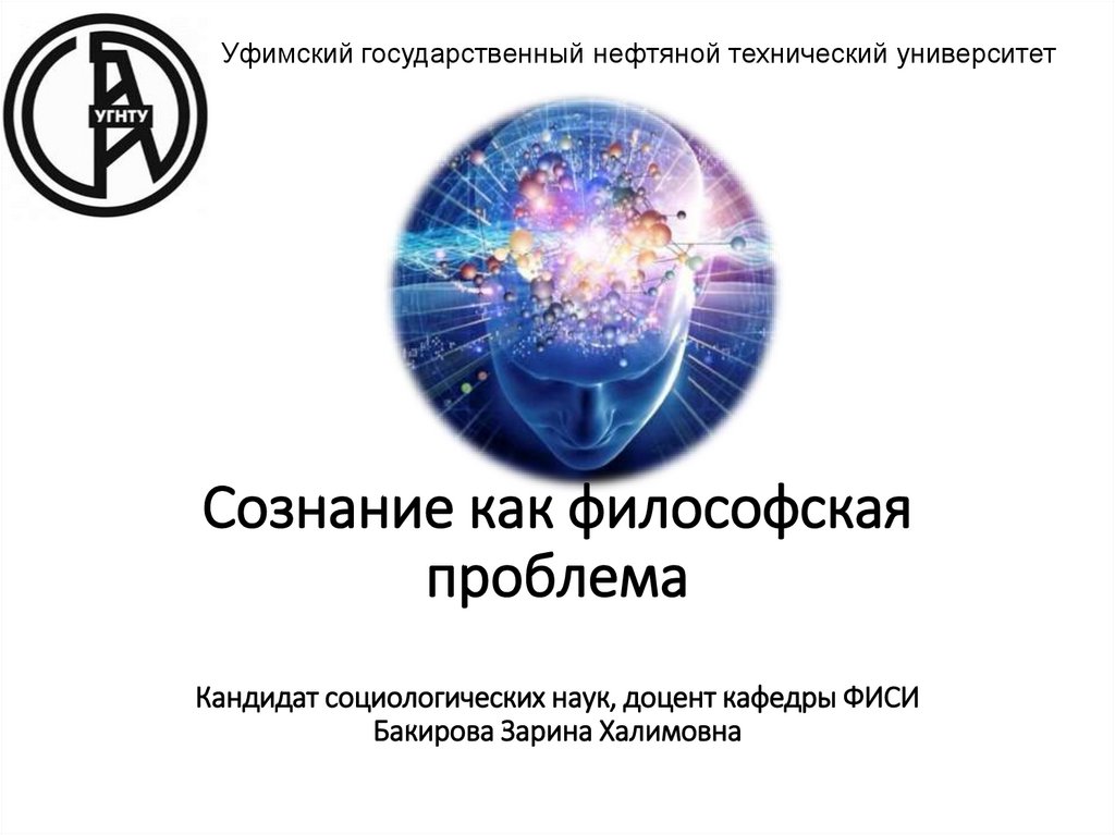 1. Сознание как философская проблема Кандидат социологических наук, доцент кафедры ФИСИ Бакирова Зарина Халимовна