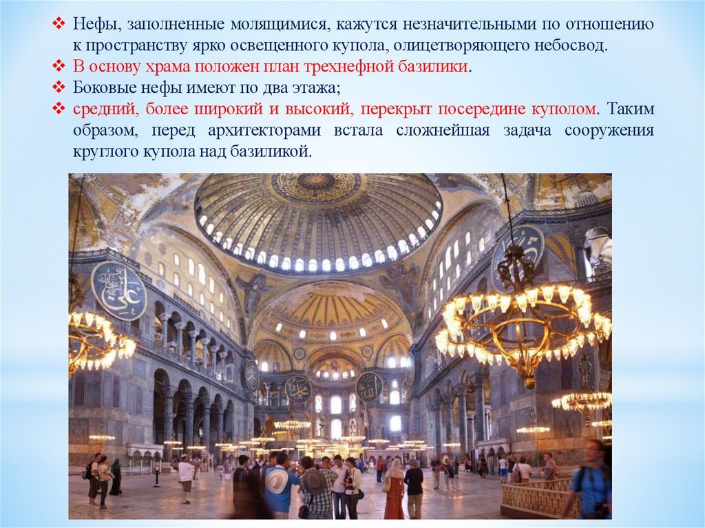 Нефы, заполненные молящимися, кажутся незначительными по отношениюк пространству ярко освещенного купола, олицетворяющего небосвод.