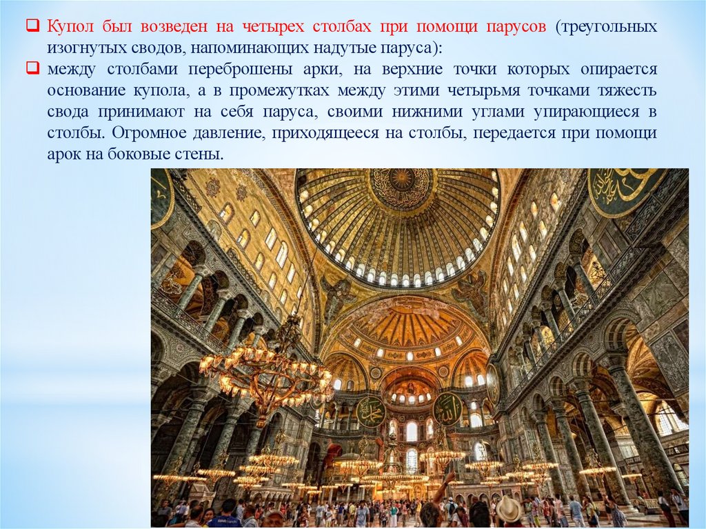 Купол был возведен на четырех столбах при помощи парусов (треугольныхизогнутых сводов, напоминающих надутые паруса):