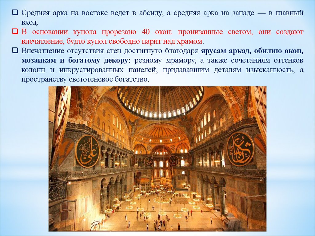 Средняя арка на востоке ведет в абсиду, а средняя арка на западе — в главныйвход.