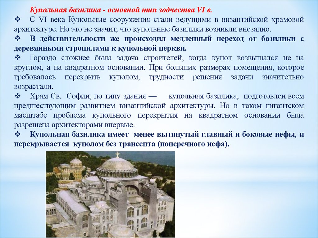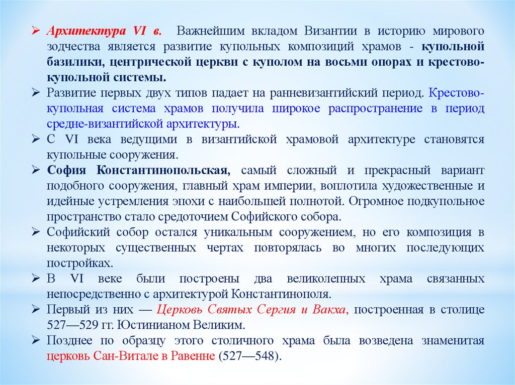 Архитектура VI в. Важнейшим вкладом Византии в историю мировогозодчества является развитие купольных композиций храмов - купольной