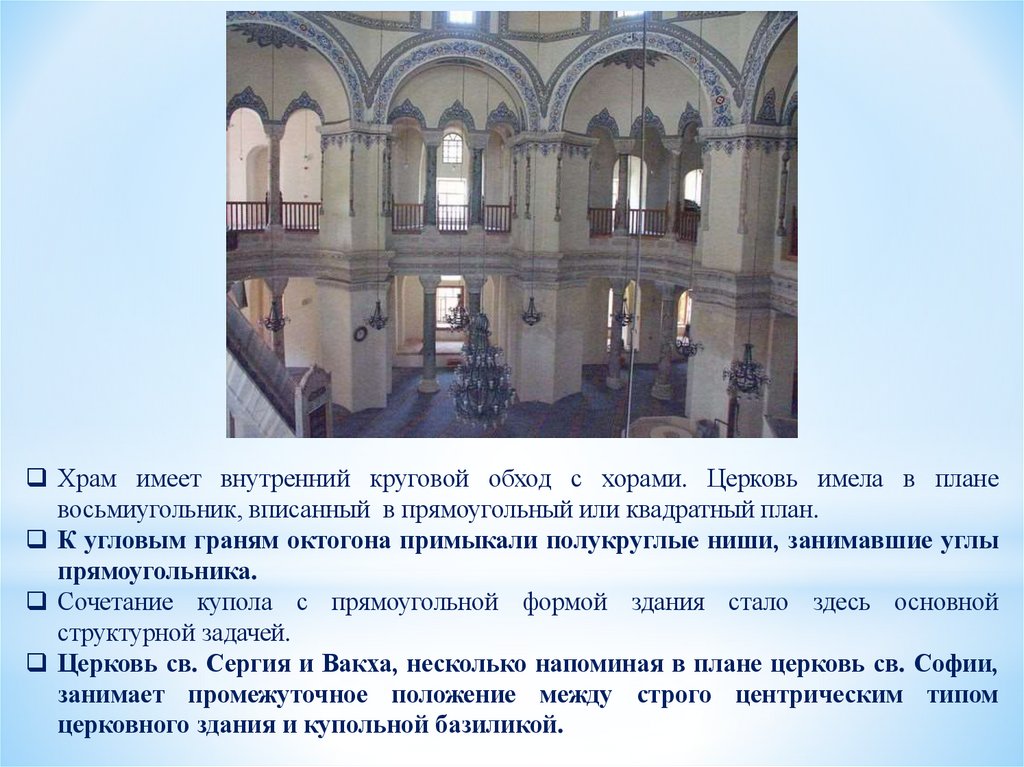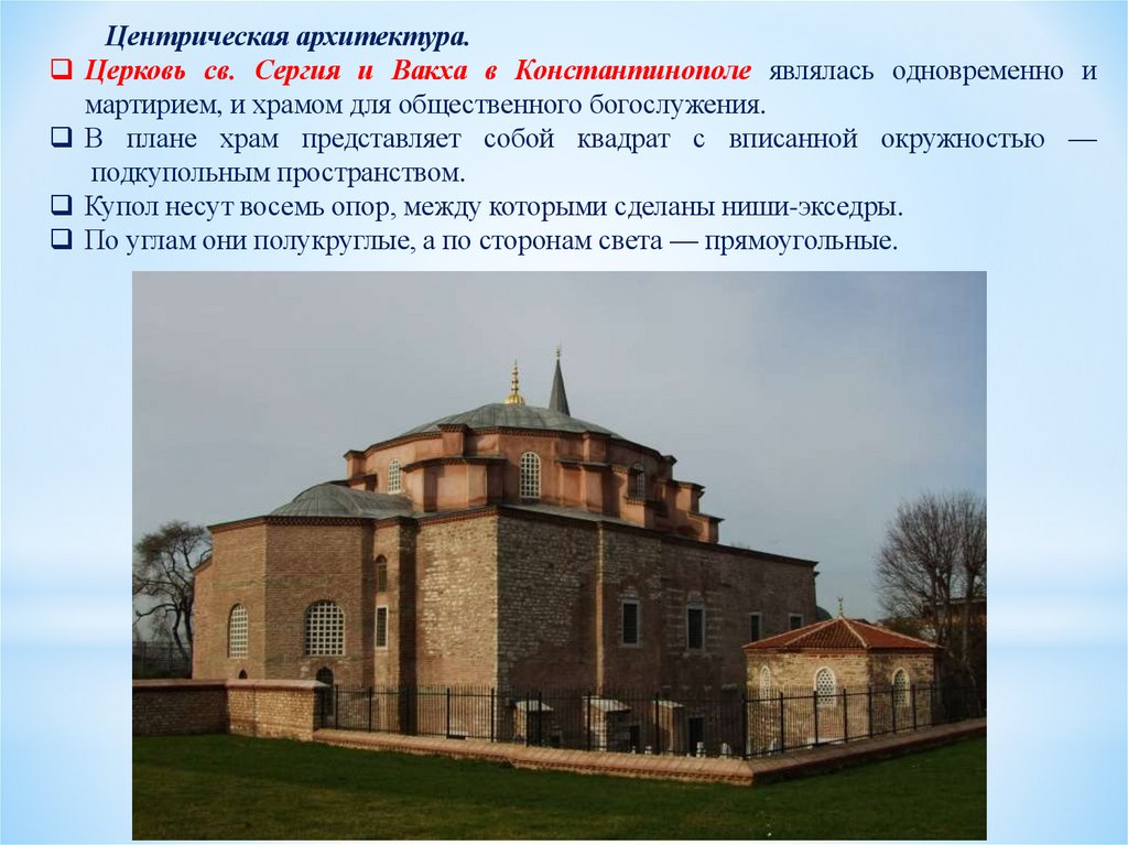 Центрическая архитектура.Церковь св. Сергия и Вакха в Константинополе являлась одновременно и