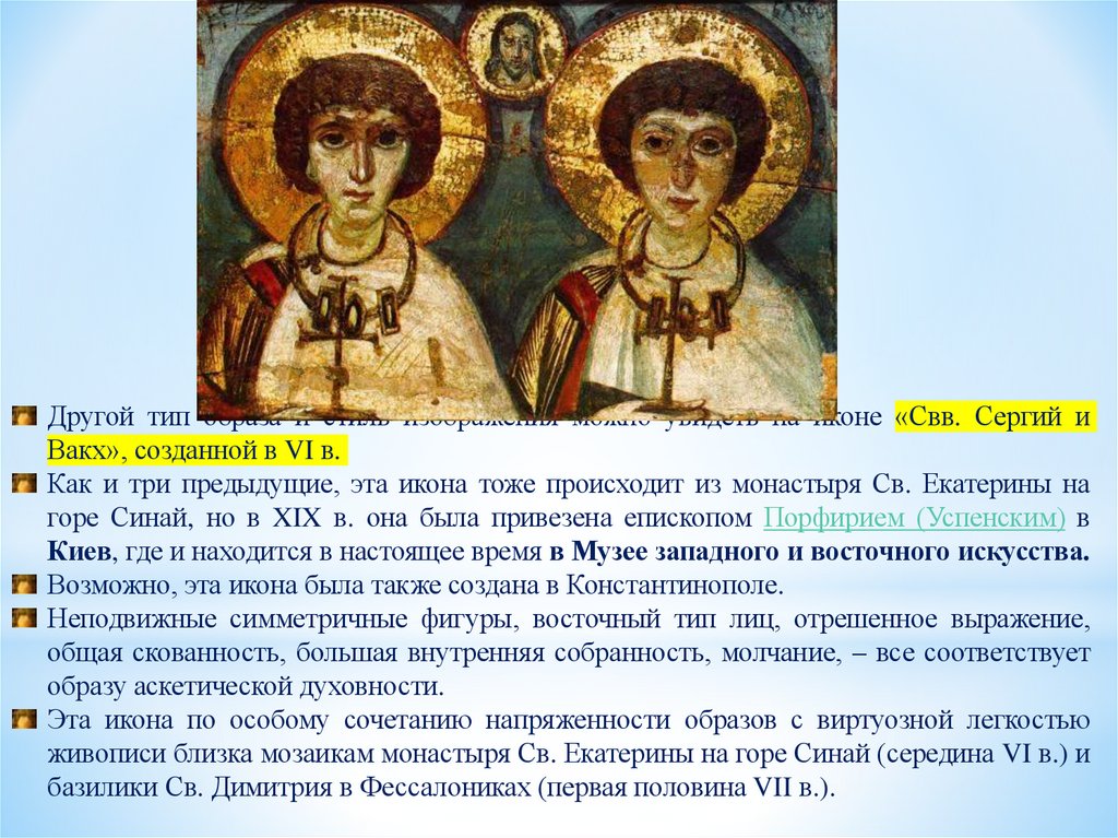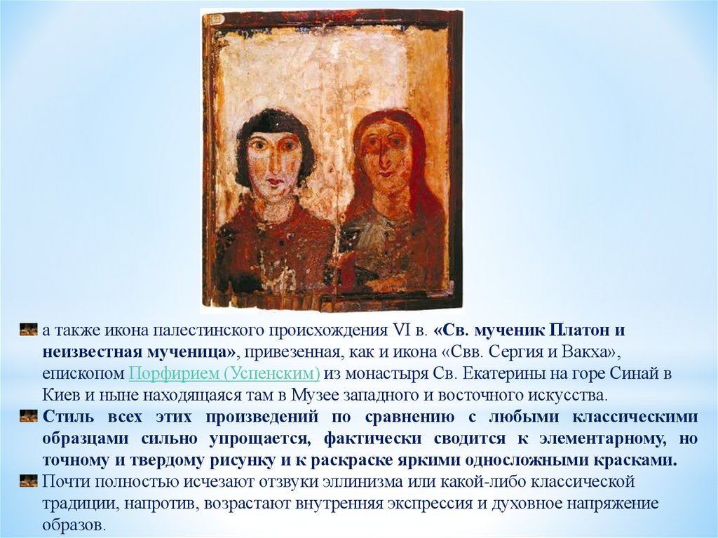 а также икона палестинского происхождения VI в. «Св. мученик Платон инеизвестная мученица», привезенная, как и икона «Свв. Сергия и Вакха»,